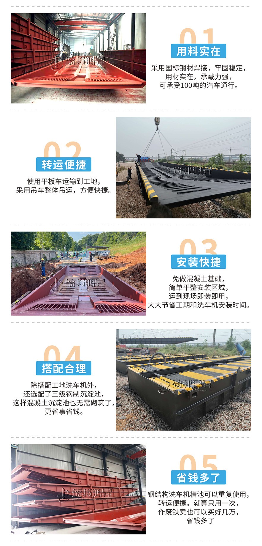 筑邦鴻昇研發鋼結構洗車槽池采用整體設計,整體吊運,用料厚實。替代了之前的工地洗車機下面的水泥基礎,更加牢固方便,節省了大量的基礎砌筑人工和材料,還可以重復使用。如果不需要重復使用;十幾噸重的洗車槽做廢鐵賣,也能賣好幾萬,大大節省了施工時間和成本。鋼結構洗車槽池常規款式有16.6米長和13米長,尺寸可以定制。1.廠家直銷,質量保證,價格實惠。2.全自動清洗,無需人工操作,可..