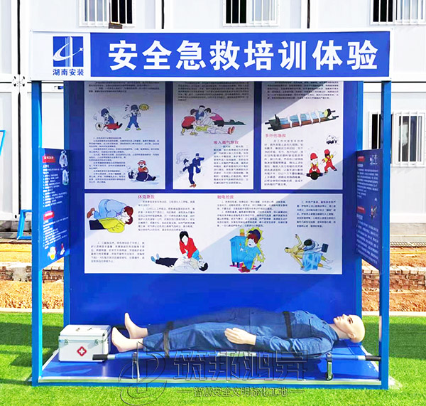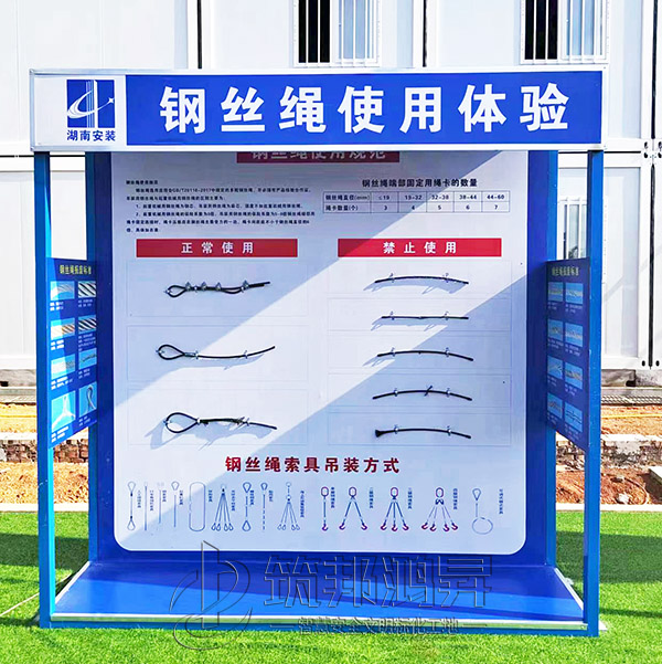 此次合作的安全教育培訓體驗區建設包括了班前講評臺、鋼絲繩使用體驗、安全防護用品展示體驗、綜合用電體驗、安全帶使用體驗、安全急救培訓體驗、移動式平臺體驗、洞口墜落體驗、消防器材柜、安全帽撞擊體驗等。標準款采用鋼結構組裝式設計,高溫烤漆不易褪色,顏色鮮艷更美觀,設計制作安裝全包。筑邦安排專車送貨到衡陽工地,同時安排了專業人手迅速到工地加班加點完成安裝。
