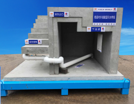 工藝展示:結構樓梯混凝土成型,抹灰企口,下掛梁,窗臺企口,外墻積水槽,射釘固定,積水收集口,排水管道安裝固定等工藝。